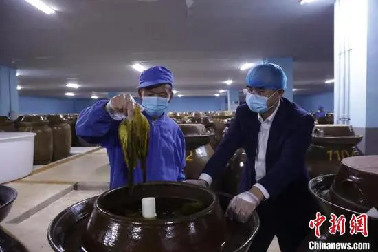 图为吴剑平查看酸菜制作情况。熊俊摄