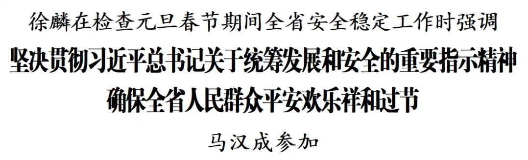 在省应急管理厅,徐麟与值班人员一一握手,向大家致以新年的祝福。在听取省有关部门汇报后,徐麟强调,全省各地各部门要坚决贯彻习近平总书记重要指示精神,认真落实中办国办关于做好2025年元旦春节期间有关工作的部署要求,时刻绷紧安全稳定这根弦,抓细抓实防风险保安全护稳定工作。要紧盯道路交通、建筑施工、煤矿、城镇燃气、消防、危化品等重点行业领域,强化风险排查整治,坚决消除火灾隐患,抓好低温雨雪冰冻灾害防范,严防各类事故发生。要强化城市商圈、交通场站、校园医院、文体场馆等人员密集场所安全防范,深入开展矛盾纠纷排查化解,确保社会大局稳定。全省各地各部门要切实做到思想认识到位、工作措施到位、人员责任到位,强化值班值守,高效抓好应急处置,全力保障人民群众生命财产安全。
