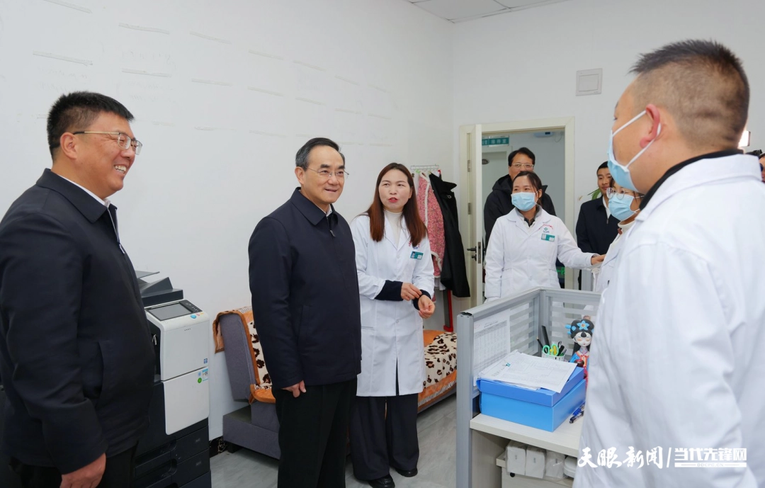 图为徐麟在威宁自治县五里岗街道朝阳新城社区卫生服务中心,了解基层医疗卫生保障情况。