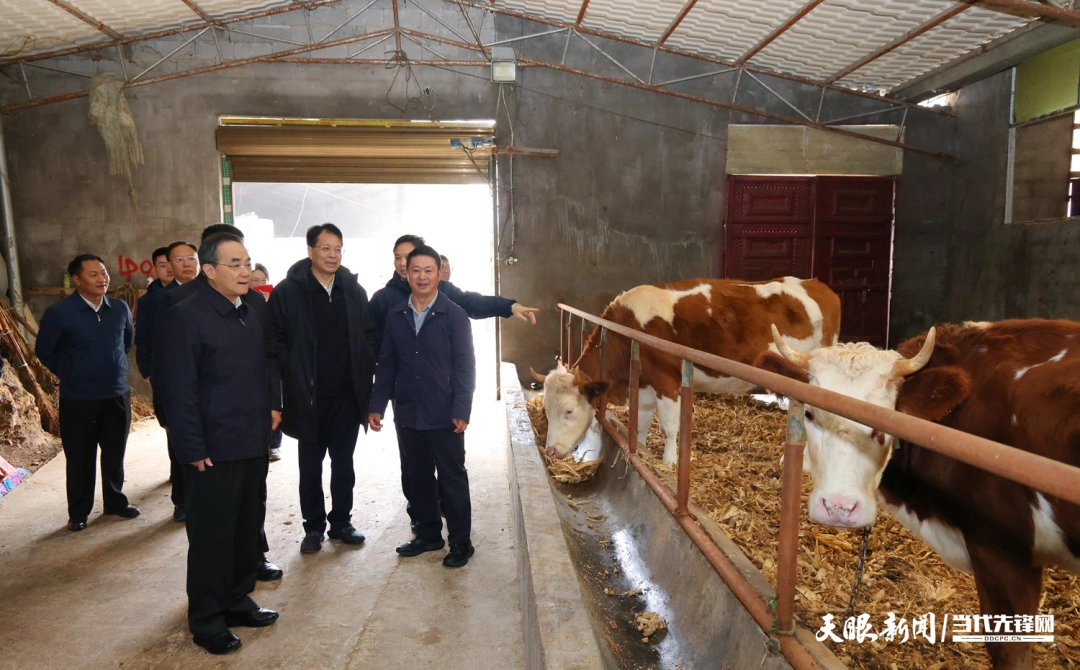 图为徐麟在威宁自治县么站镇平原村黄牛养殖场,了解黄牛产业发展带动群众增收等情况。