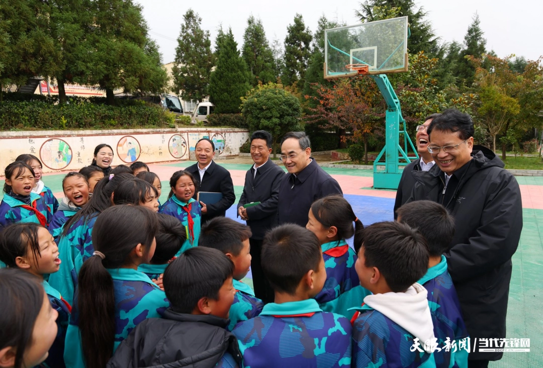 图为徐麟在威宁自治县么站镇平原村新街小学与教师亲切交流,了解教育教学等情况。