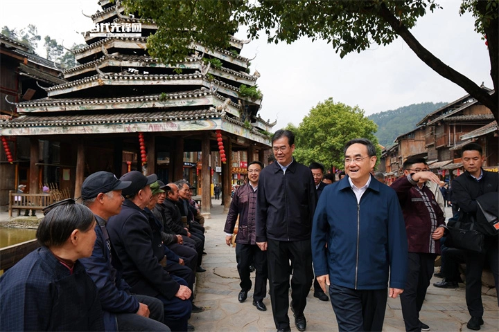 图为徐麟、李炳军在肇兴侗寨信团鼓楼旁与干部群众重温习近平总书记考察贵州重要讲话精神。