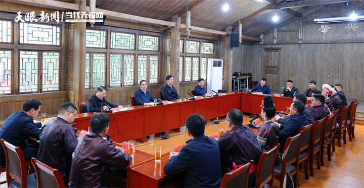 图为徐麟、李炳军在肇兴村村委会与基层干部群众座谈交流,共同重温习近平总书记考察贵州重要讲话精神。