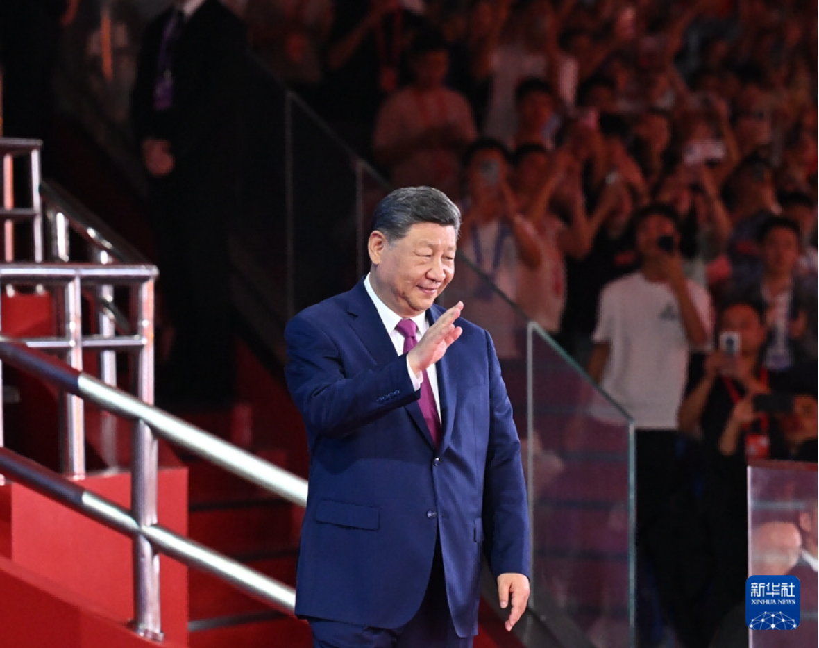 11月9日晚,中共中央总书记、国家主席、中央军委主席习近平在广东省广州市出席中华人民共和国第十五届运动会开幕式并宣布运动会开幕。这是习近平在主席台上向大家挥手致意。新华社记者谢环驰摄